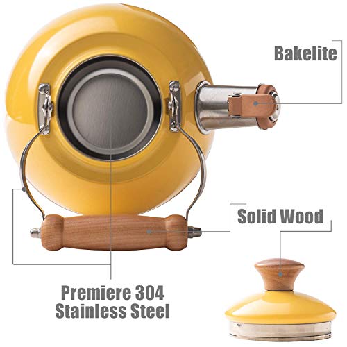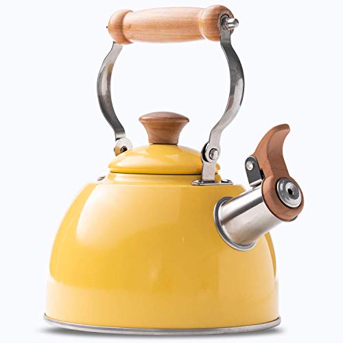 ROCKURWOK Whistling Tea Kettle, 1.6 QT / 50 OZ, Yellow Teapot, Universal Base for Induction | Gas | Electric | Halogen | Radiant, Wooden Handle, Vintage